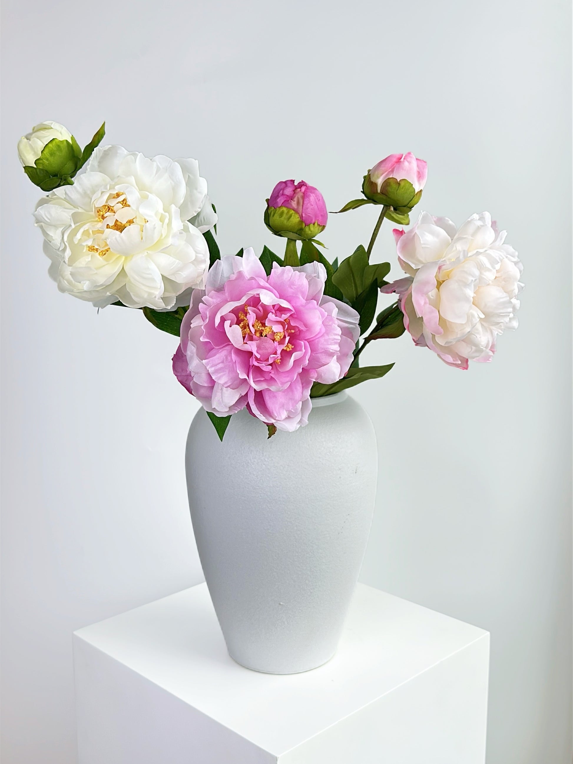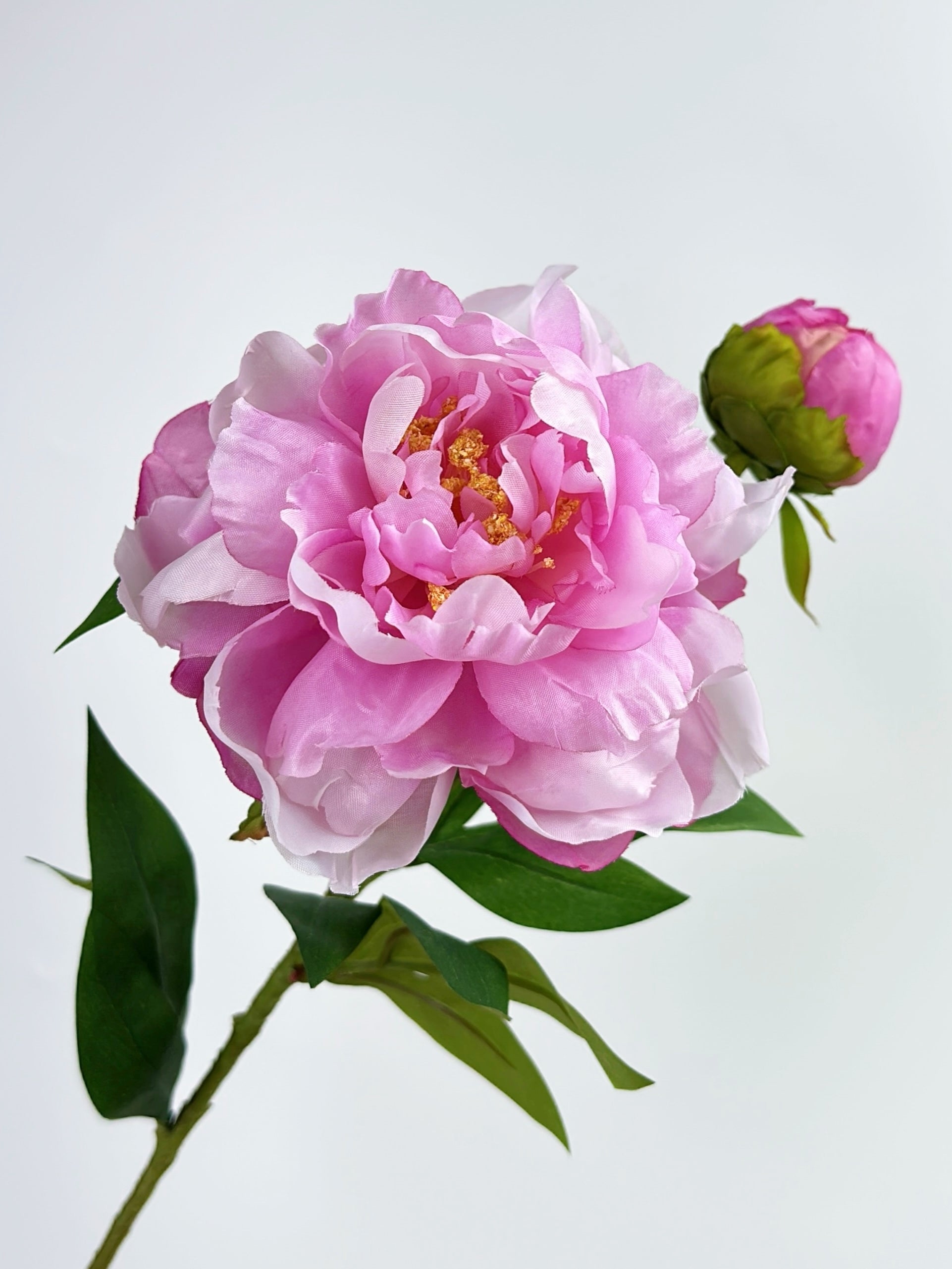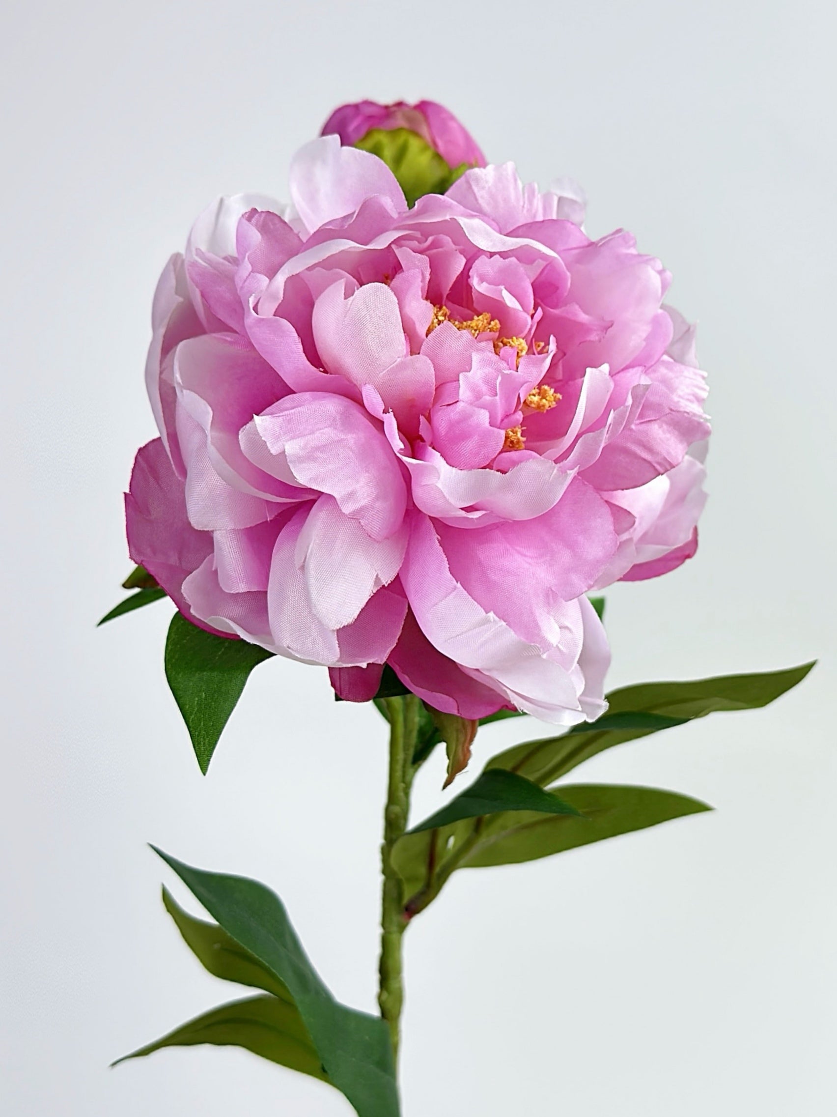 This 2-Head Luxury Peony Flower in Purple Pink, featuring a vibrant pink bloom accompanied by a delicate bud, creates a charming two-headed display. Its lively color and elegant form make it a versatile accent, perfect for adding a touch of romance to a bedside table, brightening a desk, or enhancing any small space with its timeless beauty.