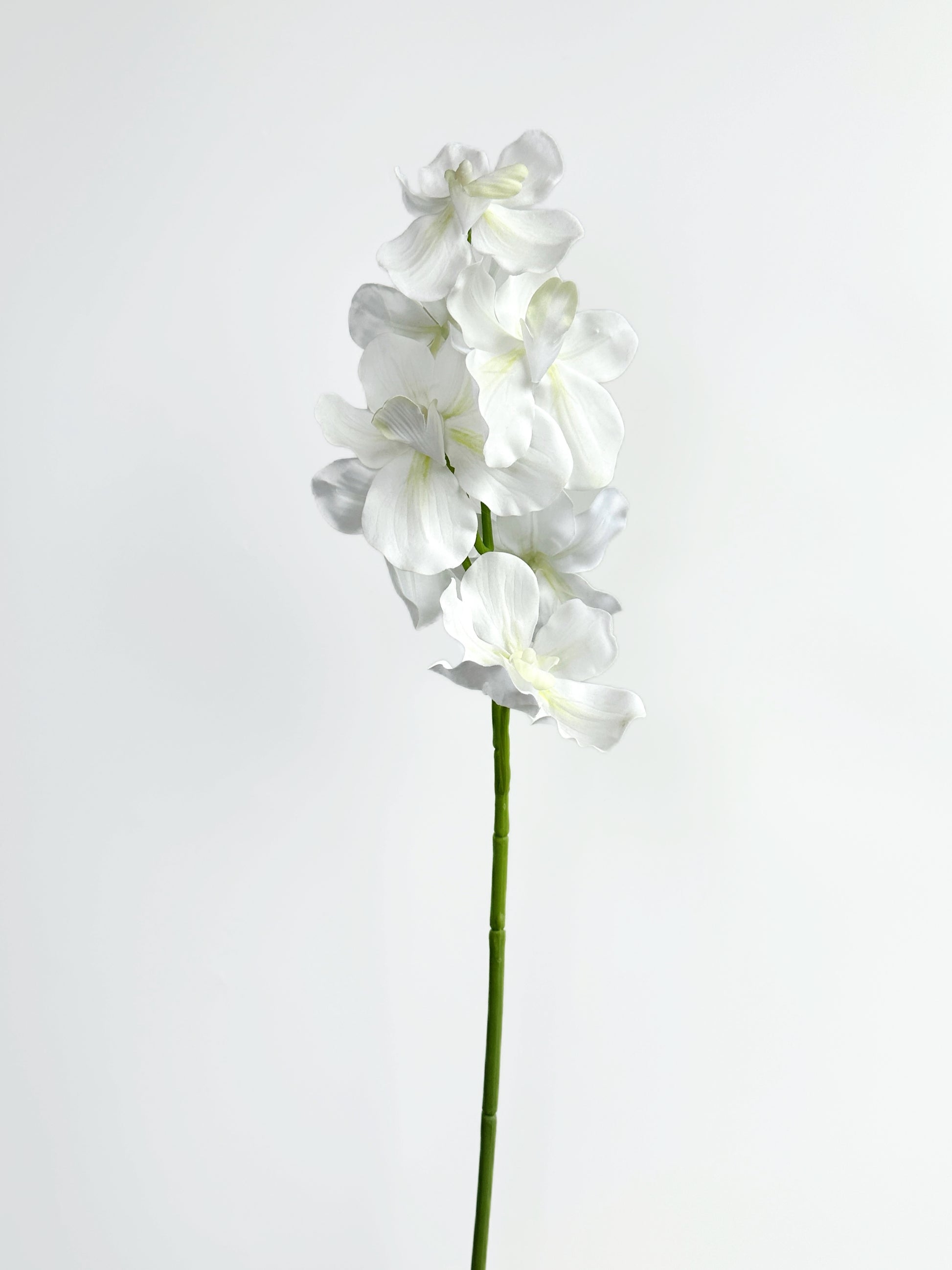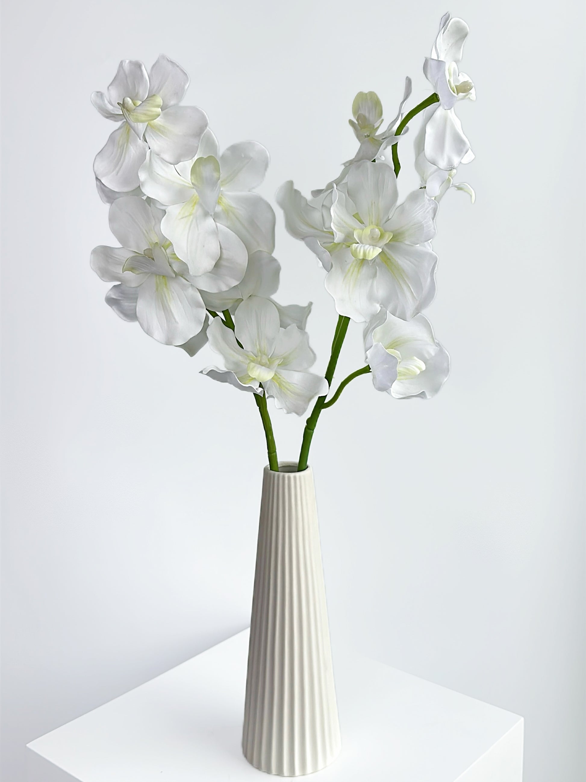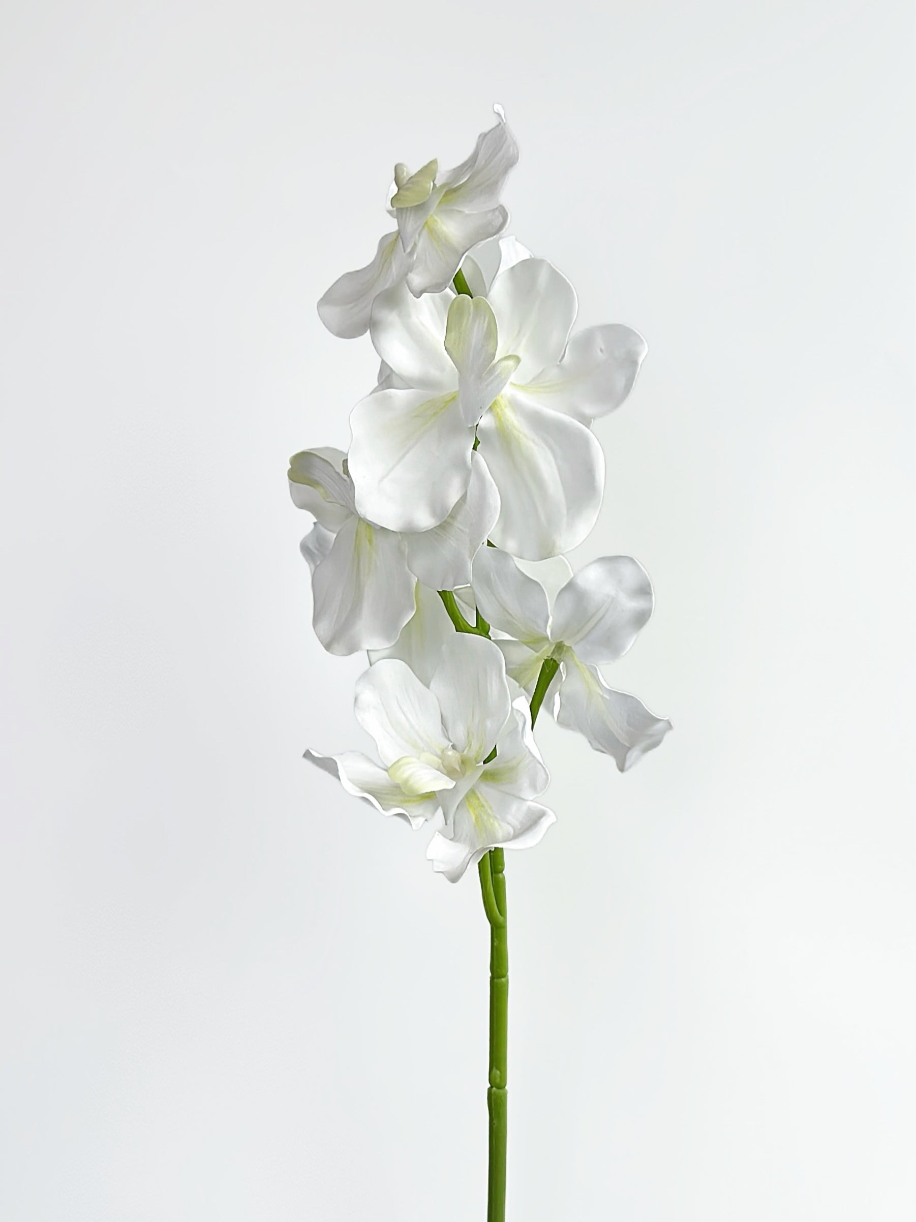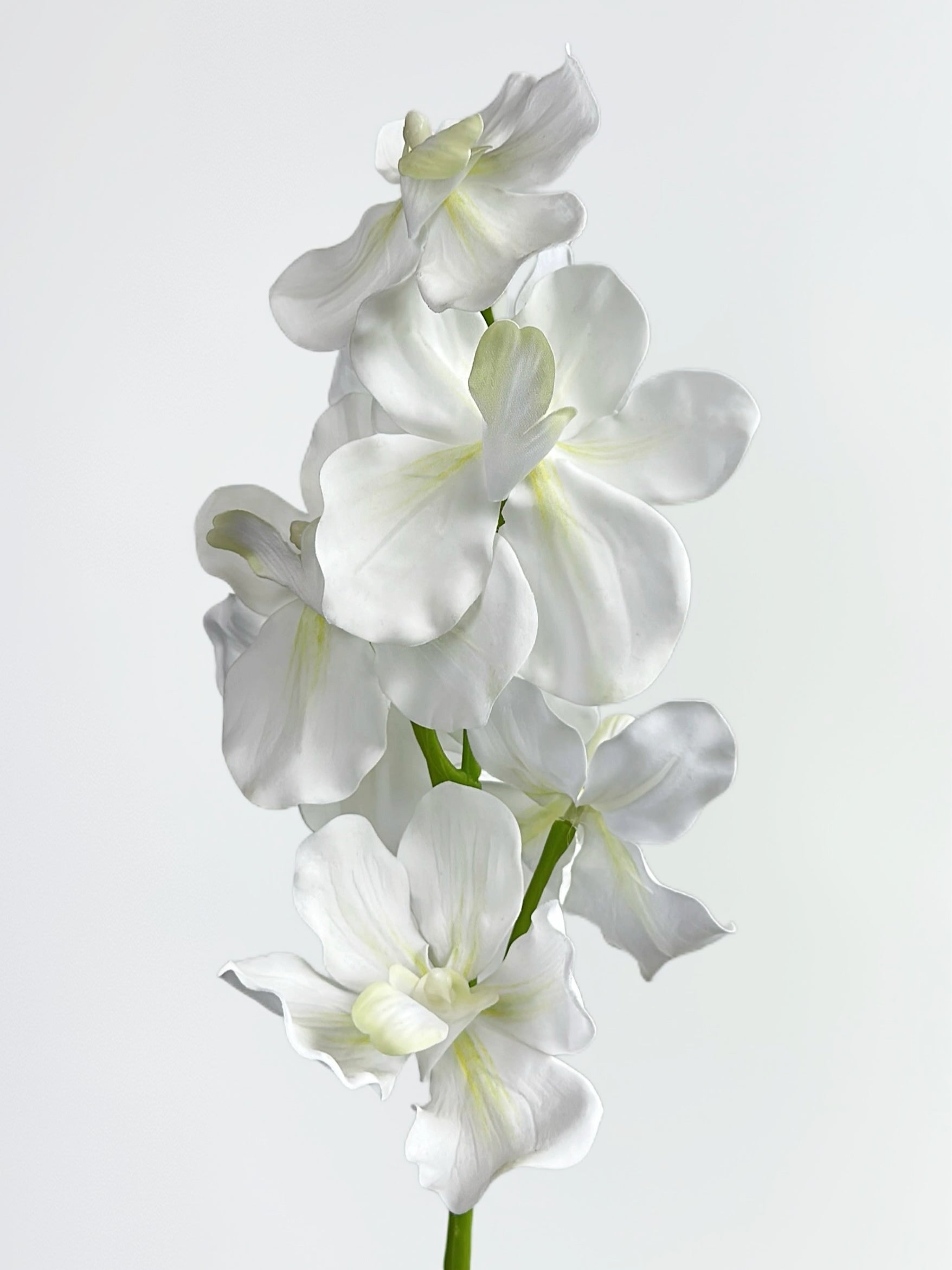 This is a Real Touch Vanda Orchid in Cream White, featuring soft, translucent petals that create an elegant and minimalist aesthetic. The pure white color radiates a sense of purity and calm, while the gently curved blooms and slender green stem enhance its graceful, flowing appearance. Ideal for modern, romantic, or Japanese-inspired interiors, this floral piece exudes quiet beauty and timeless simplicity.